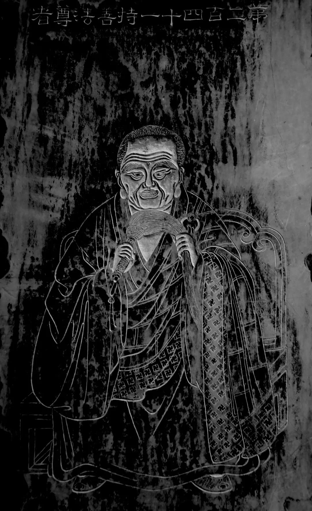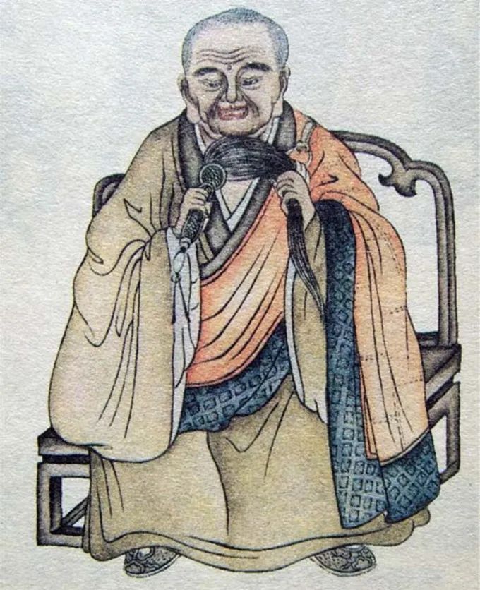 尊者法相所现为正面静坐,面有皱纹,浓眉大耳,双手执拂子。