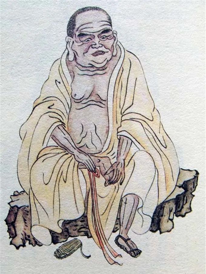 尊者法相所现为正面弯腿而坐,神态威严,双耳垂肩,袒露胸腹。