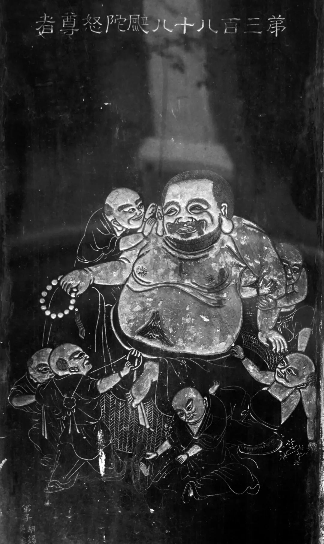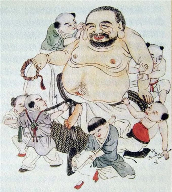 尊者法相所现为正面坐卧,袒露胸腹,笑容满面,右手持念珠,周围有诸多童子嬉闹。