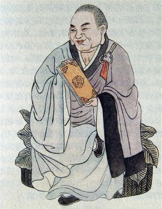 尊者法相所现为正面而坐,身披袈裟,面露笑容,双手持经册。