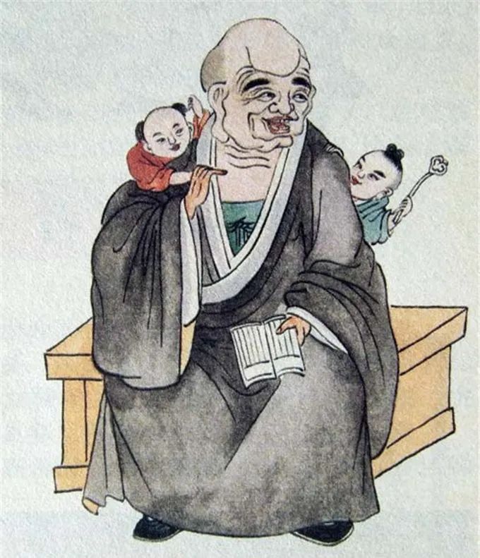 尊者法相所现为正面而坐,面露笑容,右手持笔,左手持经书,肩头有两童子嬉戏。