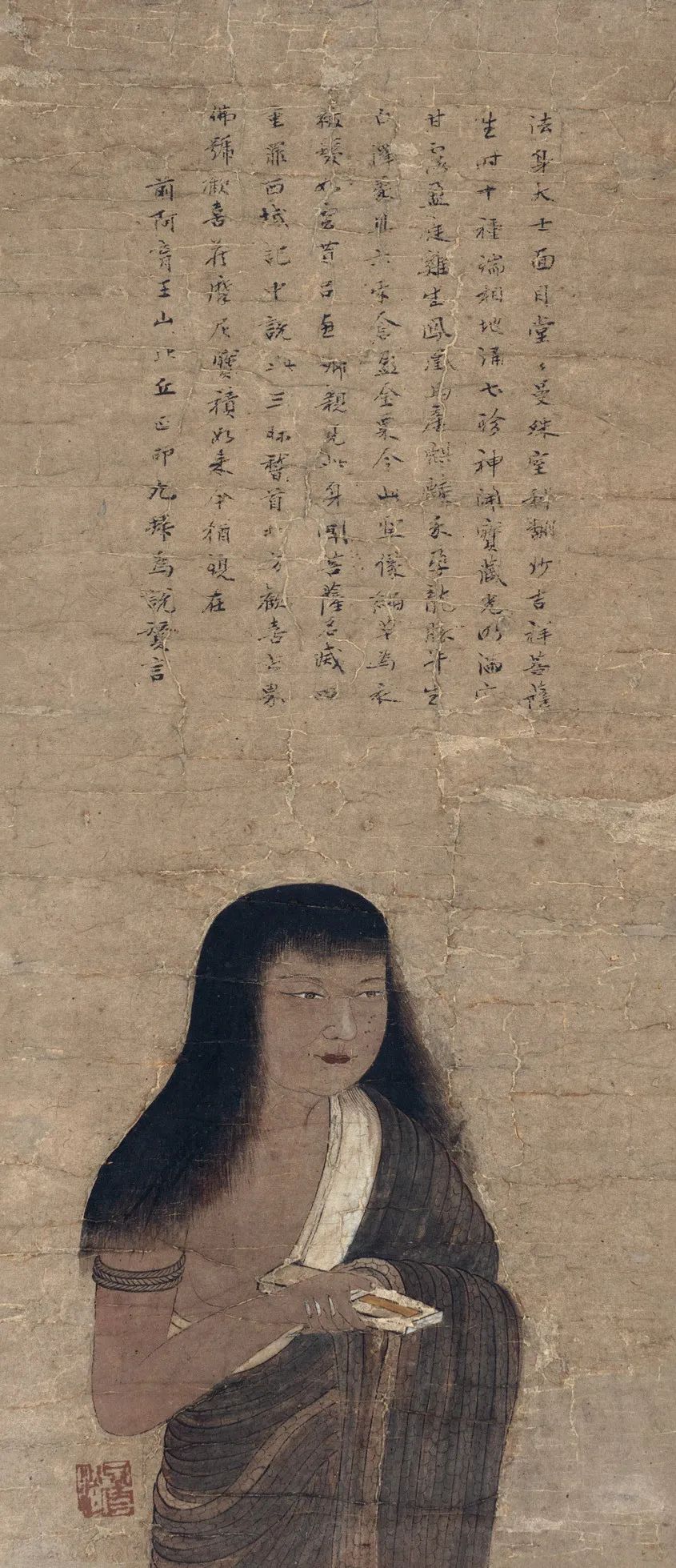 相对于显密二教之文殊菩萨像,禅门所用之文殊菩萨像多以水墨绘之,发长,蒲衣,偏袒右肩,右手持梵箧,此像称为草衣文殊。这种形象约始于宋代元丰年间(1078—1084),是太尉吕惠卿游五台山时命画工所绘。而草衣文殊像的来历,有一个著名的故事,记载在《释氏稽古略》第四卷中: