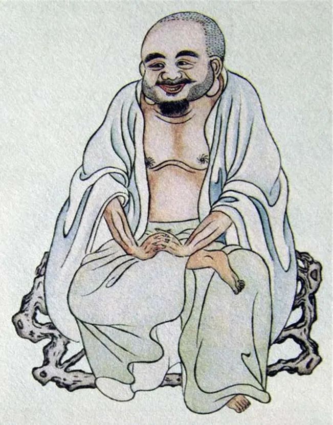尊者法相所现为正面而坐,袒露胸腹,右脚搭于左膝,双手交叉。