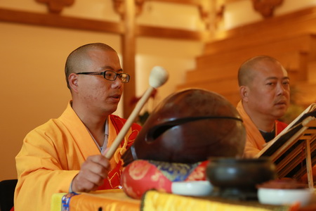7、内坛:礼拜集十二部大藏经之精华而成的水陆仪轨,包含:结界、发符悬幡、上堂、上供、告赦、请下堂、供下堂、授幽冥戒、圆满供、圆满香等佛事,为所有忏悔超度法门之首,冥阳两利、解脱功德不可思量。