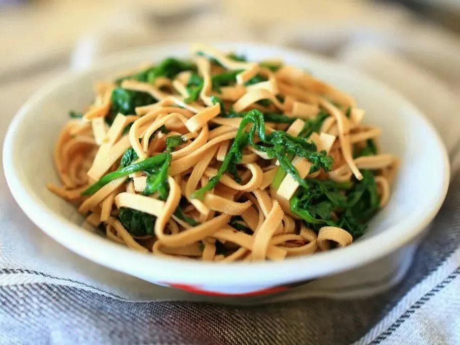 7. 淋在豆腐丝和茼蒿叶上,拌均匀即可