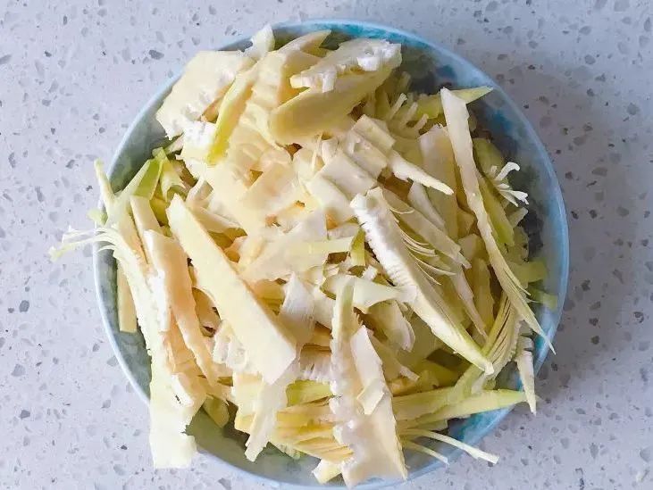 2. 水煮沸加盐,倒入春笋焯2分钟,捞入凉水中