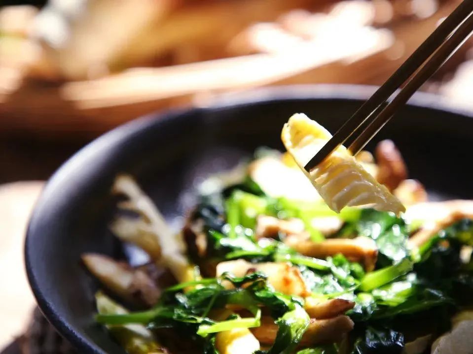 1. 春笋剥去笋衣切条状,茶树菇洗净去根,豌豆尖用清水浸泡清洗