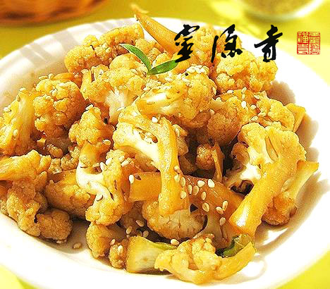 3、闷到花菜变软后,加入之前调好的备用调味料,再闷到你所喜欢的软烂程度即可。装盘后撒上熟芝麻。