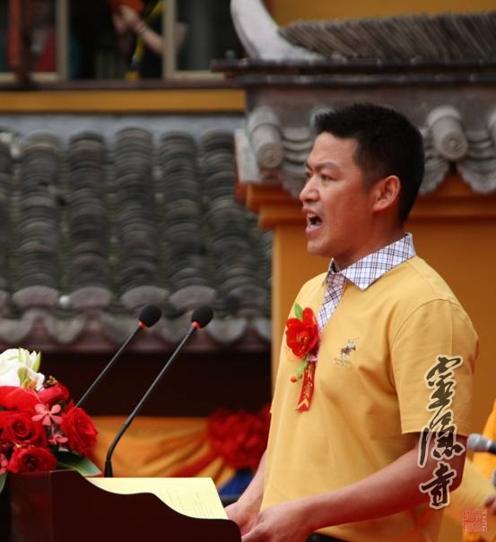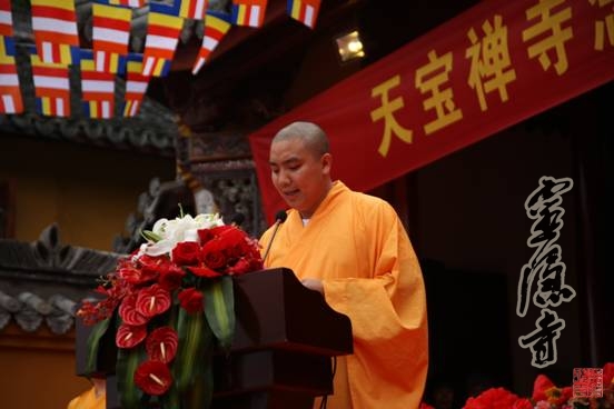 当日上午,天宝禅寺内佛旗飘扬,经幢高悬,钟磬和鸣,梵音高唱。光泉法师入室弟子、天宝禅寺监院慧传法师首先致欢迎辞,他代表天宝禅寺住持光泉法师和天宝禅寺全体僧众,感谢各级政府部门对寺院重建恢复工程的支持和关心,感谢善信居士们常年护法天宝禅寺。慧传法师回顾了光泉法师住持天宝禅的历史因缘,以及自己受光泉法师委派,参与具体主持天宝禅寺重建恢复工程的历程,表示一定要不负恩师和四众弟子期望,把天宝禅建成一方佛门名刹和众佛子心中的一片修行净土,推动东阳市佛教文化跨时代发展,引领广大信众爱国爱教,为建设和谐东阳作出贡献。