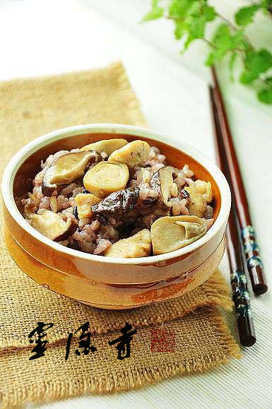 5、待煮饭键跳起时,拨下插头,倒入炒好的素肉蘑菇,和五谷饭一起拌匀,盖上盖利用电饭煲的余温再焖5分钟即可。