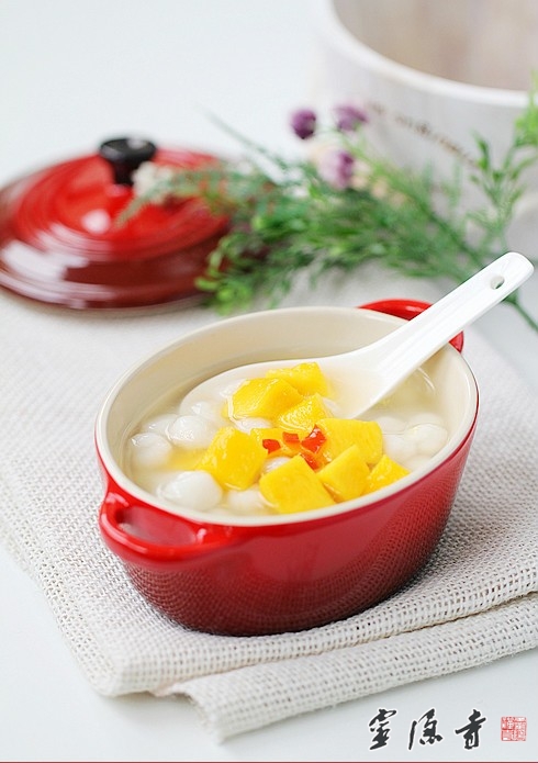 食材:芒果半个、汤圆20个、淀粉少许、冰糖少许、樱桃肉丁少许、水500ML