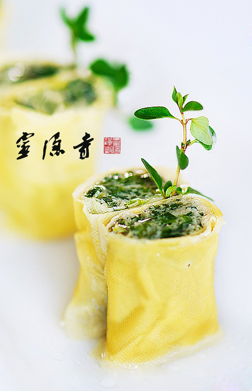 8.取出百叶包,从中间一切为二,二段一组竖立在盘中。锅中汤汁,勾一点点薄芡,淋在百叶包至上。最后用新鲜百里香点缀菜品。