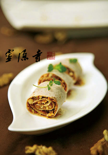 6、将核桃仁、花生仁、大枣的混合物均匀撒在春卷皮上,卷起来,切成段即可。