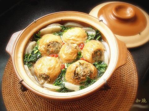 8、瓤好的面筋放入砂锅内,周边填入芜菁片。