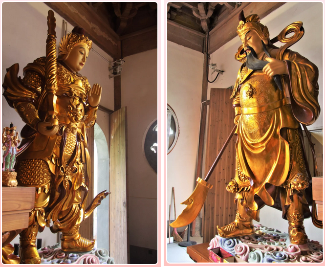 许多佛教寺院在大雄宝殿东西两侧塑伽蓝菩萨与韦驮菩萨圣像,并称佛教寺院的两大护法神。韦驮菩萨为东序护法,伽蓝菩萨为西序护法。