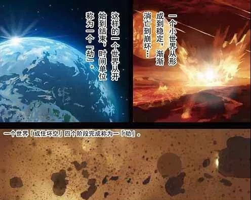 佛典分世界之成坏为成住坏空四劫。劫者,译云时分、大时、长时,此大时不能以通常之年月日计算,时极少为刹那,时极长为劫。从人寿无量岁(八万四千岁),每百年减一岁如是减至十岁;又从十岁每百年增一岁,如是增至八万四千岁。此一增一减为一小劫,即一千六百八十万年。二十个小劫为一中劫,中劫又分成住坏空四劫。在成劫中有二十个增减,即三亿三千六百六十万年。住坏空亦如是,有四个中劫共有八十个增减,即有十三亿四千四百万年为一大劫。