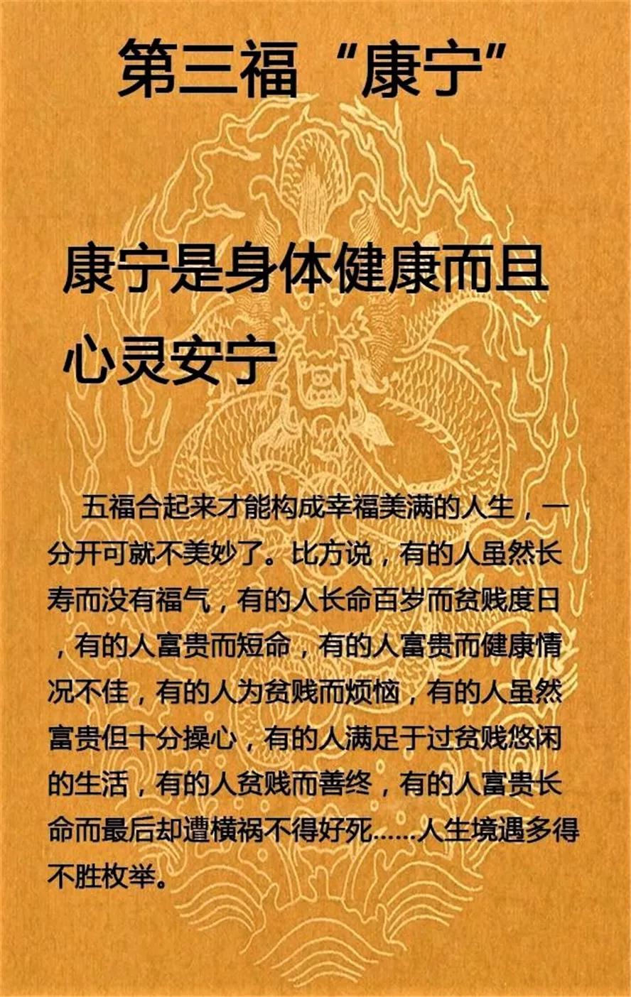 《尚书·洪范》有五福之说:"曰寿、富、康宁、修好德、考终命,世人谓之洪福。"古人认为,"长寿、富贵、康宁、好德、善终"为五福,五福合起来才能构成幸福美满的人生。