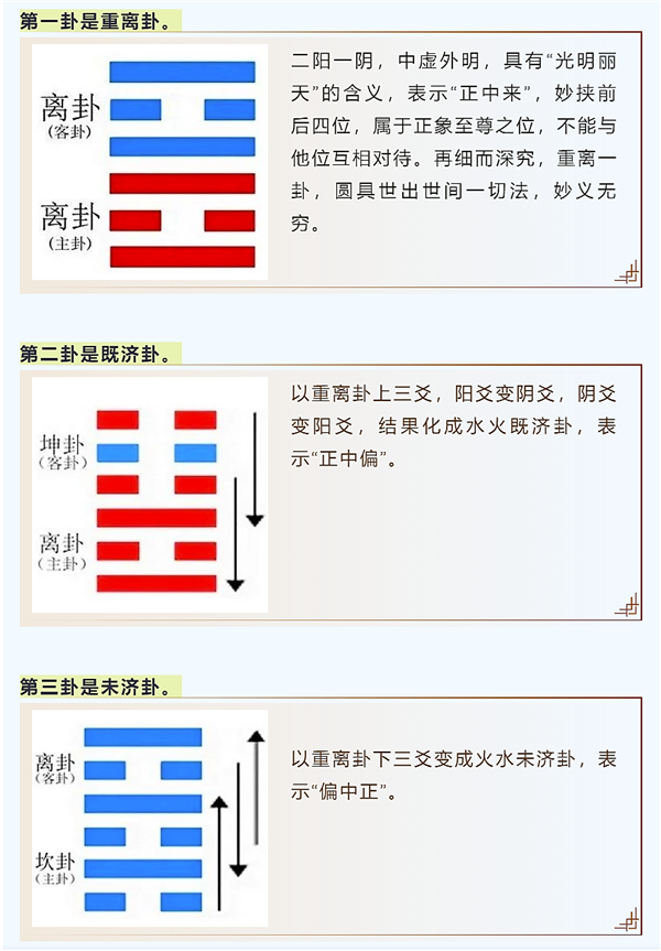 所谓“叠而为三(初二爻为一叠,三四爻为一叠,五六爻为一叠),变尽成五(互动变化成为五个卦)”,是以正为阳爻,偏为阴爻,重离六爻,偏正回互。下面逐一解释: