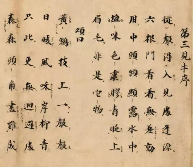 黄莺清啼,日暖风和,柳枝摇绿,赏心悦目。“本来面目”通过声色等呈显出来,处处都有它的作用,但它又是如此的妙用无痕,如水中盐味,色里胶青,必须具备慧耳慧目,才能使它无处回避。它头角森森,却又离形绝相,绝非丹青所能描画。见牛较之见迹是一大进步,但见牛并非得牛,见道尚非得道,它只是初步开悟。