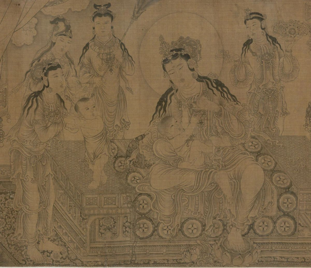 园中有一大树名无忧,花香色艳,枝叶柔软低垂。夫人即举右手攀彼树枝,这时太子遂从右胁而生,全身放大光明,遍照诸天世间。天帝释以微妙天衣裹手,承接太子,四大天王也抱着太子向摩耶夫人庆贺。