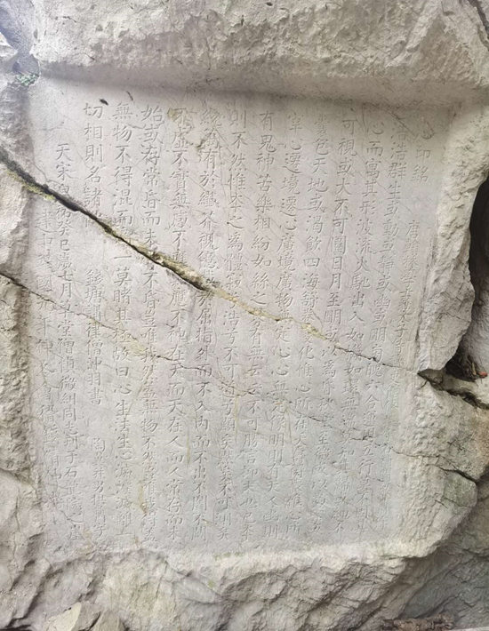 此次寻访的另一个惊喜,便是在石龙洞造像边上一个十分隐蔽的两大岩石间,发现了一块摩崖石刻《心印铭》。题刻上部山石突出,形成天然保护罩,使得心印铭题刻少受酸雨等侵蚀,保存相对完好,字迹至今仍清晰可辨。其书法是典型的承唐古法之作,通篇古穆端庄,结字中宫收紧,字势章法疏密有度,为北宋楷书的经典范本,较之唐楷毫不逊色。
