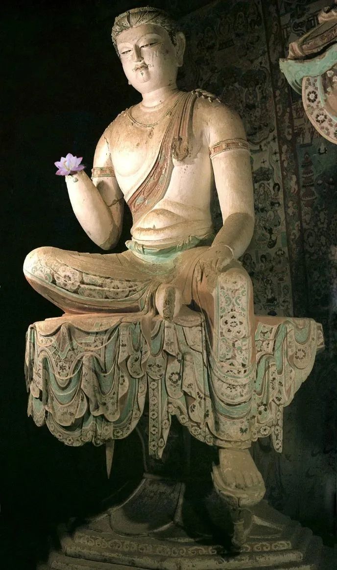 极乐世界中的人是莲花中化生,而大势至菩萨所托莲花,便是为了迎接化生的人们。正如《楞严经》中大势至菩萨说:“我本因地,以念佛心入无生忍,今于此界,摄念佛人归于净土。”可见菩萨对众生的慈悲。