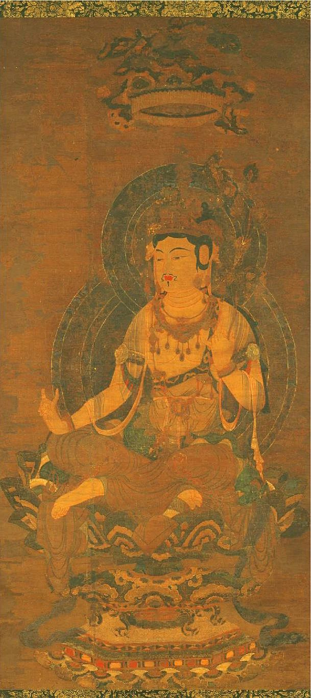 2.依据《阿唎多罗陀罗尼阿噜力经》的记载:观世音菩萨与大势至菩萨俱呈纯金色白焰光,右手执白拂,左手执莲花,大势至之身形较观世音小。于密教现图胎藏界曼荼罗中,位于观音院内列上方第二位,全身肉色,左手持开合莲花,右手屈中间三指,置于胸前,坐于赤莲花上。密号持轮金刚,三昧耶形为未开敷之莲花。