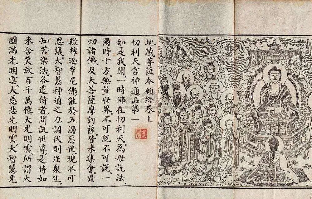 释迦牟尼佛在还没有入涅槃之前,上升到忉利天为母亲说法,令母亲能够见到佛道迹象,进而修佛道,正显示了佛弟子出世间之大孝。地藏菩萨在因地中就是孝子,做过婆罗门女、光目女,都是为了救度亡母,始发菩提大愿,与佛陀上升忉利天为母说法志愿相同,属于同声合响。