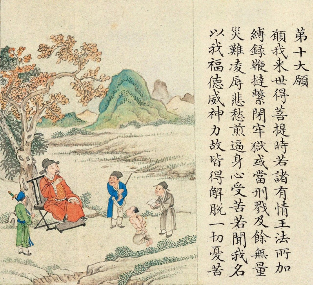 愿我来世得菩提时,若诸有情王法所录,缧缚鞭挞,系闭牢狱,或当刑戮,及余无量灾难凌辱,悲愁煎迫,身心受苦,若闻我名,以我福德威神力故,皆得解脱一切忧苦。