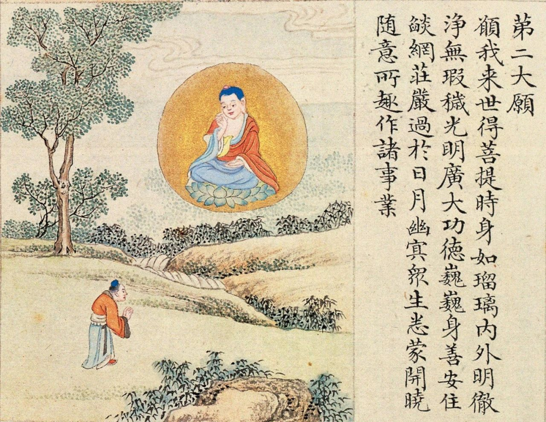 愿我来世得菩提时,身如琉璃,内外明彻,净无瑕秽,光明广大,功德巍巍。身善安住焰网庄严,过于日月,幽冥众生悉蒙开晓,随意所趣作诸事业。