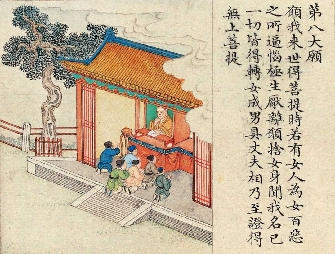 愿我来世得菩提时,若有女人为女百恶之所逼恼,极生厌离,愿舍女身,闻我名已,一切皆得转女成男,具丈夫相,乃至证得无上菩提。
