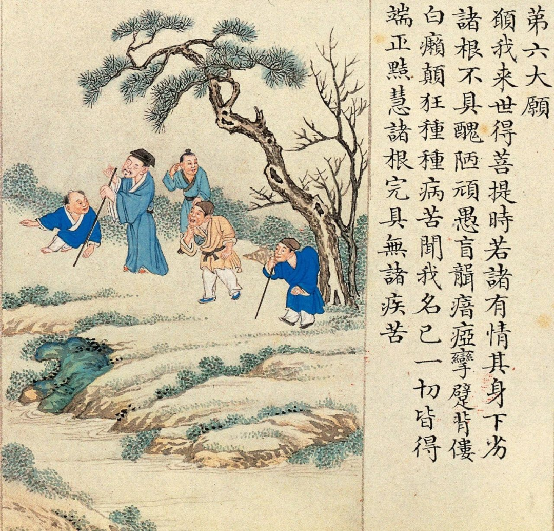 愿我来世得菩提时,若诸有情,其身下劣,诸根不具,丑陋顽愚、盲聋喑哑、挛躄背偻、白癞癫狂种种病苦,闻我名已,一切皆得端正黠慧,诸根完具,无诸疾苦。