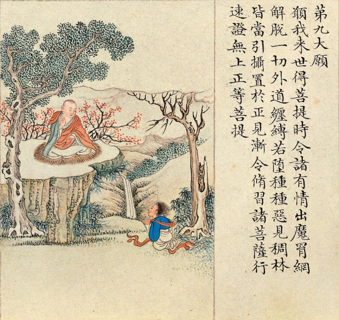 愿我来世得菩提时,令诸有情出魔罥网,解脱一切外道缠缚,若堕种种恶见稠林,皆当引摄置于正见,渐令修习诸菩萨行,速证无上正等菩提。