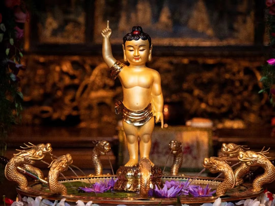 ⑫天上天下惟吾独尊:释迦牟尼是从母亲摩耶夫人的右胁出生的,堕地能立,周行七步,步步生莲花。释迦太子遍观四方,一手指天,一手指地,大声说:“天上天下,唯我独尊。”