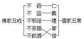 那末,如何是初会不证果而待二会证的呢?是由于释迦佛法中亦能起决定信心,皈依三宝,虽不发大乘心,修六度行,而因信仰决定,乐善好施,守持三皈五戒,由三皈而对佛教三宝起信仰心,而成为三宝弟子,由遵持五戒成为人类中的有道德者,故虽不能赴胜妙的龙华初会,而于二会亦得闻法修行,超凡入圣。三皈即皈依佛,皈依法,皈依僧。五戒即与儒的“五常”相近,如表: