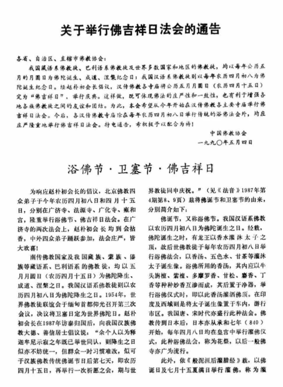 1990年5月4日,中国佛教协会发出《关于举行佛吉祥日法会的通告》,希望全国各汉传佛教寺庙积极响应赵朴初会长倡议,于每年公历五月月圆日举行佛吉祥日法会,纪念佛陀诞生、成道、涅槃三期同庆之辰,并以此体现佛法的庄严性和一致性,增强各地各族佛教徒之间的友谊和团结。
