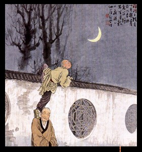 过了一会儿,一个小和尚在黑暗中踩着老禅师的脊梁跳进了院子。当他双脚着地时,惊觉刚才踏的不是原来放的那把椅子,而是自己的师父。小和尚顿时惊慌失措,张口结舌。