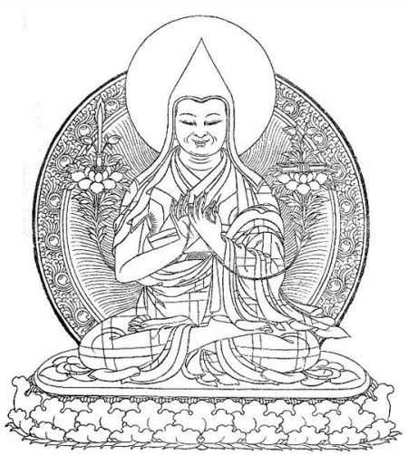 宗喀巴大师为文殊菩萨应化,智慧无比。每日读生书十七篇,皆能熟记。又一日看百十卷,(现在一日看百十卷者尚有其人)其敏速如是。至其著述有十八函之多,所著无序跋等文,皆重要佛法,合弟子等所撰述,共计三十八函,此三十八函,为根本要籍,其余解释此三十八函各书亦甚多,约百函左右,统摄三藏十二部性相显密,真法门之宝库也。