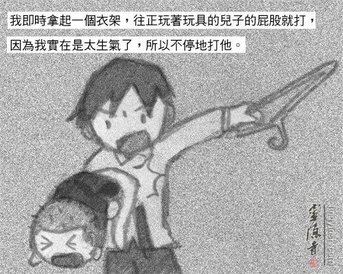 有一天晚上回到家,他只是很简短地和孩子打个招呼,就因为身体疲累,不想吃晚餐,脱掉西装之后就直接往床上躺下。就在那个时候,砰的一声,红色的汤汁跟泡面瞬时弄脏了床单和被单,原来有碗泡面在棉被里!这小子真是的,他拿起一个衣架,跑出去,往正玩着玩具的儿子的屁股就打。