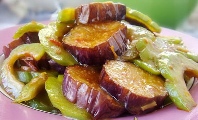 3、另起锅热油,爆香姜末、黄豆酱,加入半小碗水、生抽、蘑菇精,再倒入茄子、苦瓜炒约2分钟,勾欠即可出锅。