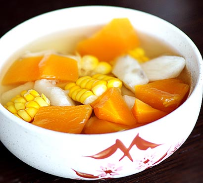 7、取汤碗,放入山药、玉米、胡萝卜,倒入步骤6素鲜汤,加少许盐、蘑菇精上笼蒸45分钟。放入木瓜,再蒸15分钟,取出即可。