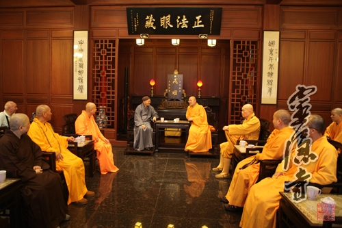 妙峰长老一行在大雄宝殿拈香礼佛,随后由光泉大和尚亲引至联灯阁,宾主亲切交流。