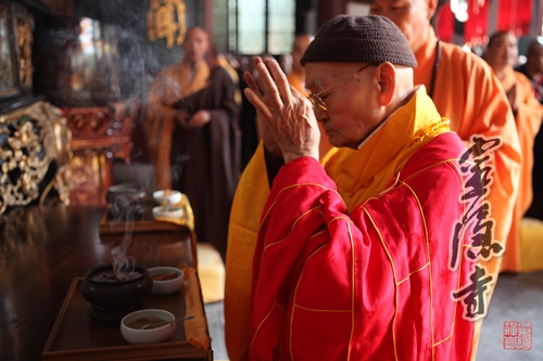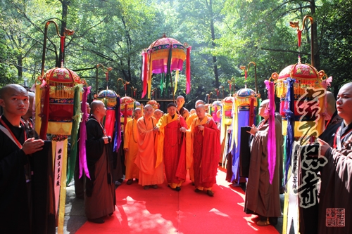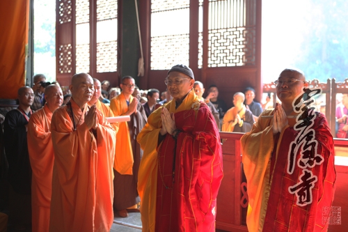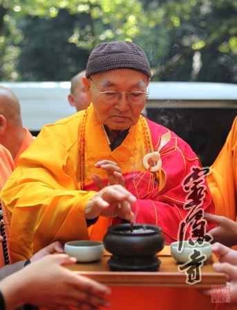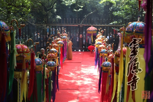 当日上午,在中佛协常务理事、浙江佛协副会长、杭州佛协会长、我寺方丈光泉大和尚和众引礼师的率领下,戒子们执持幡、香炉、灯、伞盖等一应庄严仪仗,列队排班,到山门前恭迎美国中华佛教会会长妙峰长老法驾。