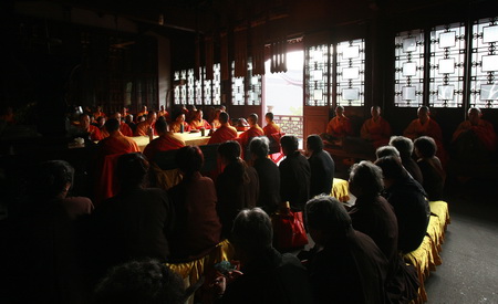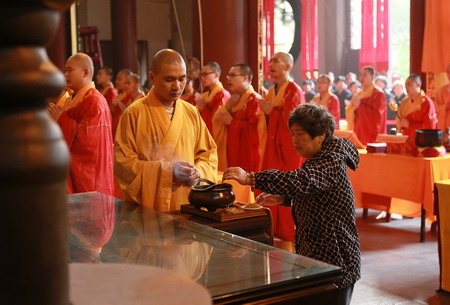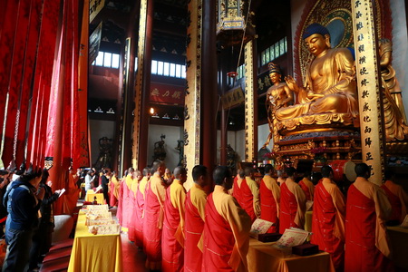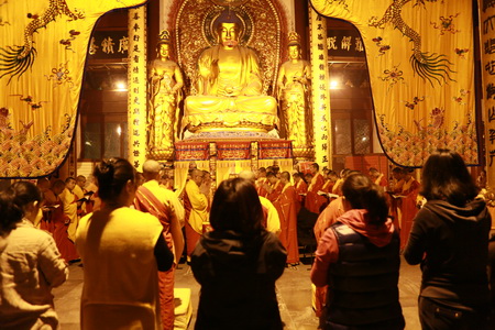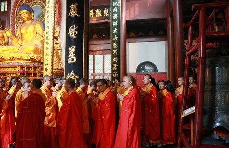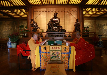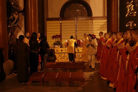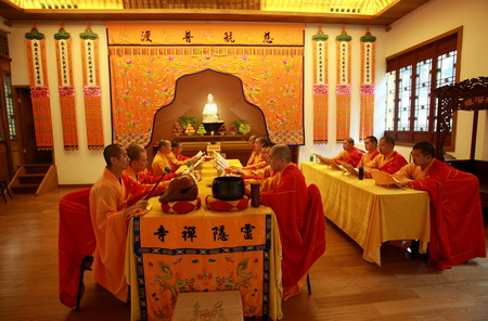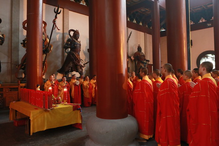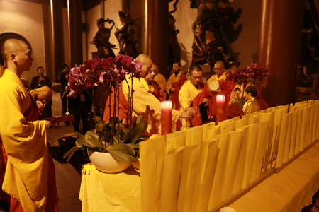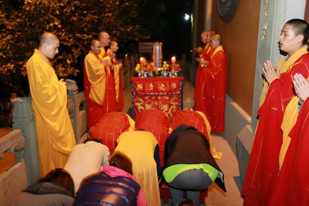 11月4日,灵隐寺水陆法会第一天,各坛佛事如法启建,大坛全天礼拜《梁皇忏》,晚上放三大士焰口一堂。