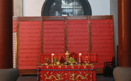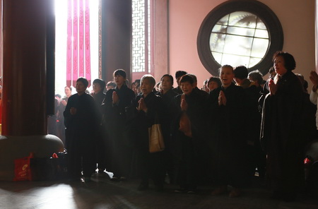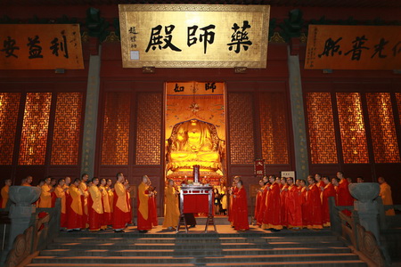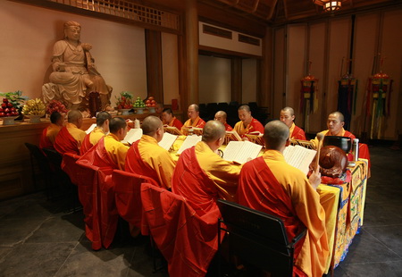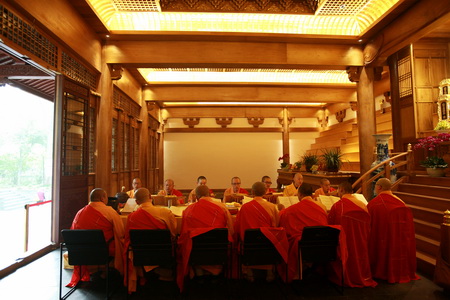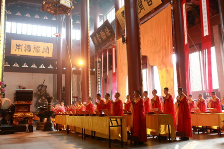 当天上午七点半至下午四点半,法师、居士于大坛(药师殿)礼拜《梁皇忏》,并以礼忏功德,回向给本次水陆法会功德主、四众弟子,超度历劫姻亲债主,普济六道四生。