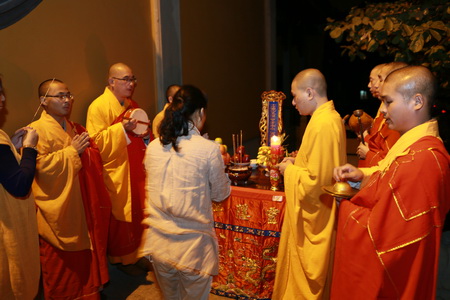 当晚六点,大坛施放三大士瑜珈焰口,超荐幽冥界一切亡灵,使之能离苦得乐,转生人天。冥阳众生,见者法喜充满,闻者均沾利益。