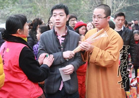 一位年老的信众舍不得将买好的高香放下,灵隐寺监院义广法师苦口婆心地宣传文明敬香的意义,增强她对保护环境的意识,终于让她有所触动,将高香放入早就准备好的塑料筐内。有些游客外出旅游,喜欢买纪念品,一游客在灵隐寺烧好香来进口处取他的寄存的两把"宝刀"时,灵隐寺监院衍空法师为了鼓励他自觉遵守文明规则的良好行为,向他微笑地举起了赞叹的"大拇指",让这位本来有些不高兴的游客高高兴兴地回家了。出口处,灵隐寺的法师们对敬完香的游客、信众,赐与我寺方丈光泉大和尚的墨宝"马年吉祥",祝福大家新年如意……