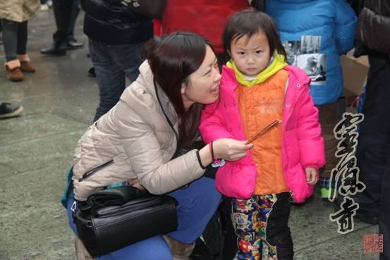 "宝宝,拜拜佛,保佑宝宝新年聪明智慧……"一位年轻的母亲蹲着,手中拿着灵隐寺免费发放的三支香耐心、和蔼地对自己年幼的孩子说。一对七八十岁白发苍苍的夫妻俩,祈求的是"马年健健康康,儿孙平平安安"。大多来祈福的是一家三口,默默敬香祈祷着,祈祷新年风调雨顺,吉祥如意……