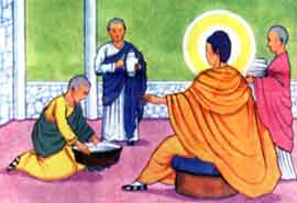 罗睺罗,释迦牟尼佛的亲生儿子,亦是佛陀十大弟子之一。又作罗护罗、罗睺、曷罗怙罗、罗怙罗、罗云、罗吼罗。意译作障月、覆障、执日。生于罗睺罗阿修罗王障蚀月时,又因六年处于母胎中,为胎所覆,故有障月、覆障之名。生于成道之夜。15岁出家。但他之所以先做沙弥,是因为不到受具足戒的年龄,后以舍利弗为和尚,目犍连为阿阇梨(轨范师)。罗睺罗是佛教僧团中第一位沙弥。他开始修行的时候比较淘气,学法持戒也有疏忽的地方,因此受到过父亲佛陀的训诫。佛陀更是曾以"洗脚水"为喻跟他说明谎话之肮脏,来针对其喜欢说谎的坏习惯。后来罗睺罗努力精进,证得了阿罗汉果,被称为"密行第一"。