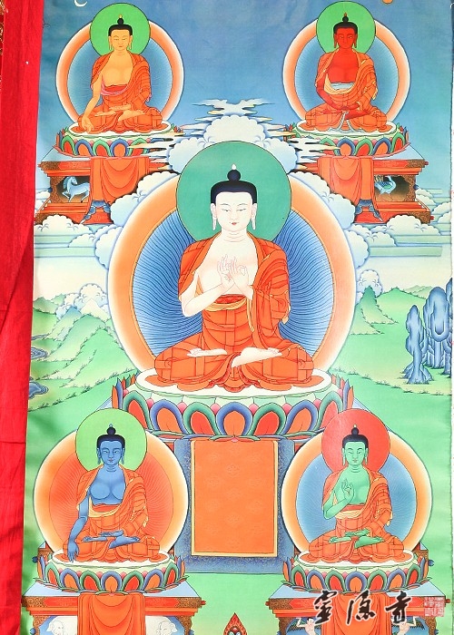 在佛教密宗里,供奉的主尊佛是"五方佛"。 "五方佛"又称"五智佛"、"五智如来"。 五尊佛中,正中者是法身佛毗卢遮那佛,接下来是南方具德净土宝相佛、东方喜悦净土阿閦佛、西方极乐净土阿弥陀佛、北方胜业净土不空成就佛。这五尊佛代表中、南、东、西、北正方。其中东、南、西、北四方的佛又称作"四方四佛"。